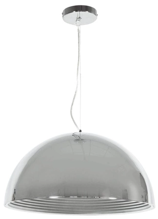 - ekskluzywna wersja prostego metalowego abażura; idealnie lustrzana chromowa powierzchnia zewnętrzna z niespotykaną strukturą wewnętrzną; ozdobny odbłyśnik pod żarówką, całość zawieszona na metalowej lince.