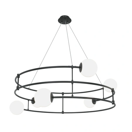 Lampa została wykonana z trwałego metalu w eleganckim, matowym czarnym wykończeniu oraz wysokiej jakości szklanych kul, które nadają projektowi wrażenie lekkości i finezji. Metalowa konstrukcja jest stabilna i odporna na codzienne użytkowanie, a kontrast kolorystyczny sprawia, że lampa wydaje się delikatna, ale zdecydowana — idealna jako centralny punkt świetlny w salonie lub nad stołem.